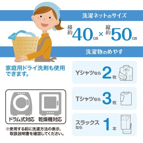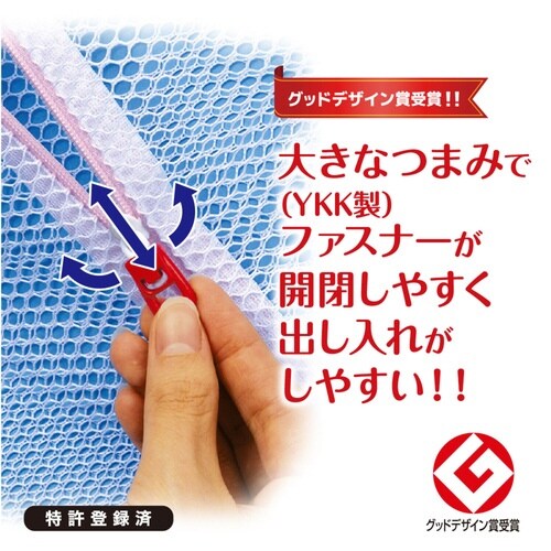 丈夫で水通しの良いレギュラーメッシュを使用した大物角型の洗濯ネットです。 ワイシャツなら2枚、Tシャツなら3枚、スラックスなら1本洗えます。 ファスナーが開けやすい大きな引き手です。 |