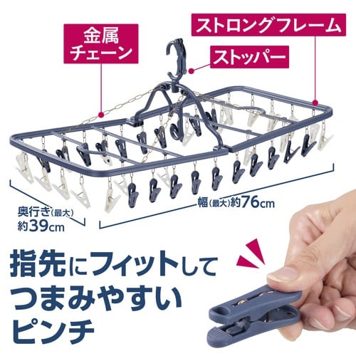 豊富なピンチでたくさん干せる角ハンガー40ピンチです。 強力ピンチが20個ついており、デニムも一気にまとめ干しできます。 |