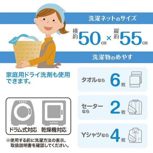大物洗いに最適な、角型洗濯ネットです。 タオルなら6枚、ワイシャツなら4枚、セーターなら2枚洗えます。 細かい編目のガードネットで、糸クズの侵入をおさえてきれいに洗えます。 |