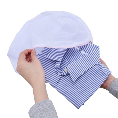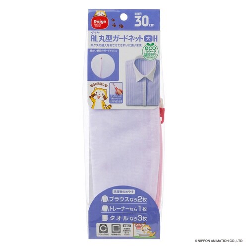 洗濯機で回転しやすい丸型の洗濯ネット、直径30cmです。 ブラウスなら2枚、トレーナーなら1枚、タオルなら3枚洗えます。 細かい編目のガードネットで、糸クズの侵入をおさえてきれいに洗えます。 |