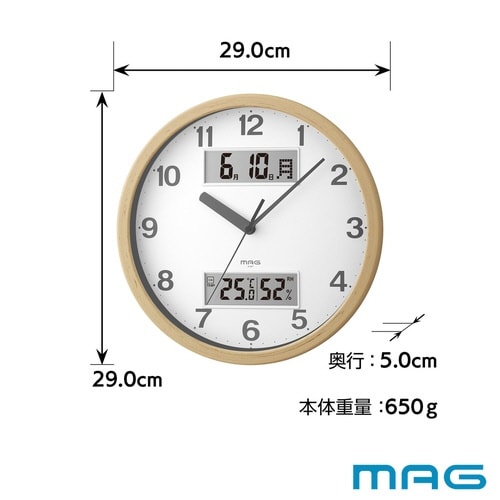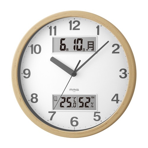 時刻、日付、温度、湿度が一目で分かります。 木目調の塗装がナチュラルな印象を与えます。 カチカチ音がしないので、寝室など静かな場所でのご使用にもおすすめです。 |
