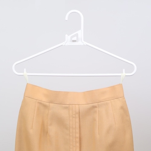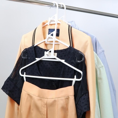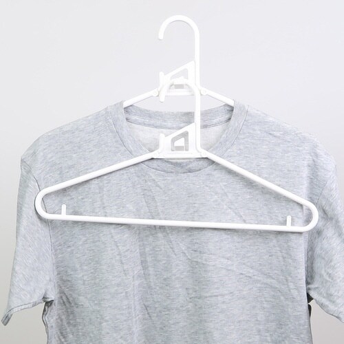 肩部を握ると変形し、Tシャツなどの丸首も襟元をを伸ばさずに掛けられる便利なハンガーです。 ハンガー同士を連結できるフック付きなので、かさばる衣類も縦にすっきり収納できます。 |