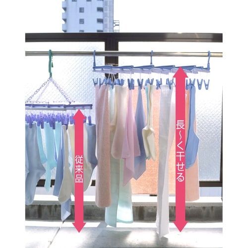 使う場所や洗濯物の量に合わせて、サイズ調節ができるピンチハンガーです。 幅を伸ばすとスリムになり、狭い場所でも使えます。 竿からピンチまでの距離が短いので、低い物干し竿でも快適です。 |