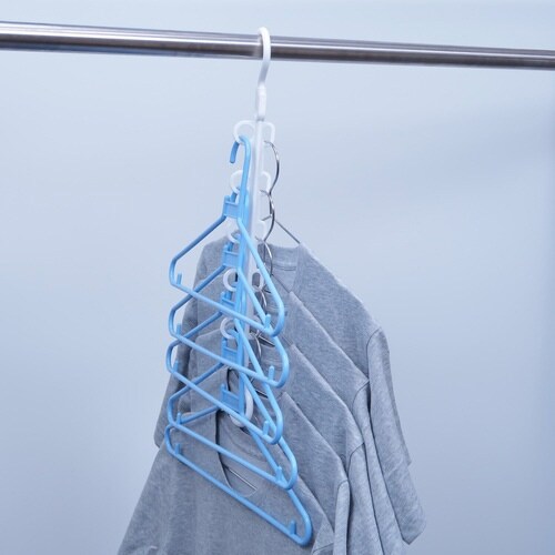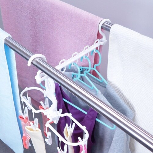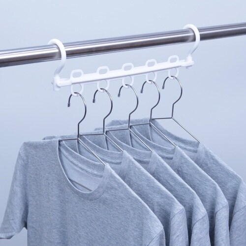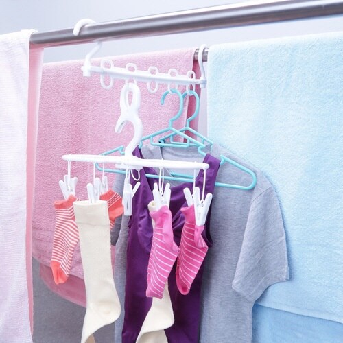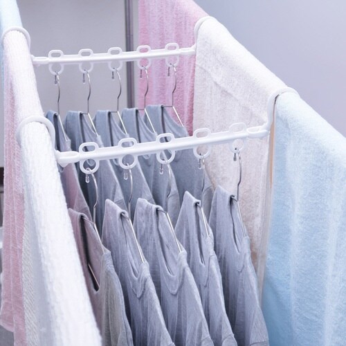 竿と竿の間に渡して、物干しスペースを確保できます。 リレーハンガーごとまとめて取り込め、そのまま収納もできます。 収納時に縦にして使えば反対側の穴も使え、計10本のハンガーが掛けられます。 |