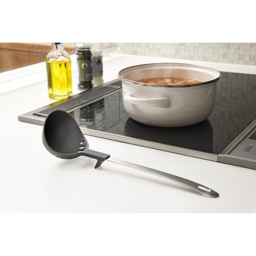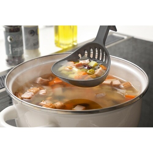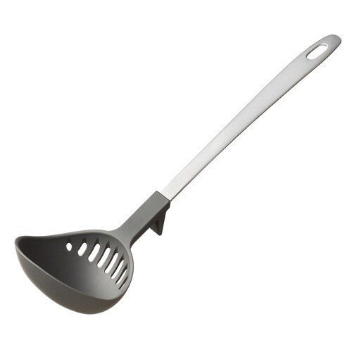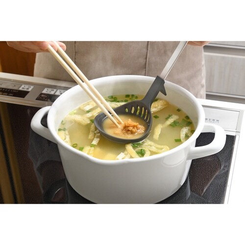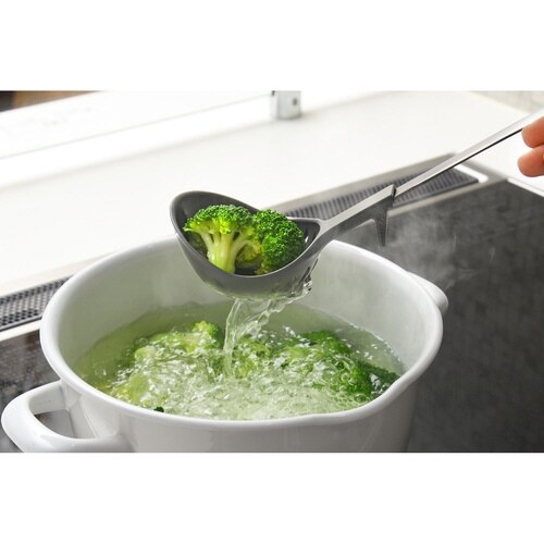 お玉と穴あきお玉が一つになった水切りお玉です。 お玉を傾けるだけでサッと簡単に水切りができます。 ウィンナーやブロッコリーなど、大きなザルを出さなくてもその場でサッとすくえます。 |