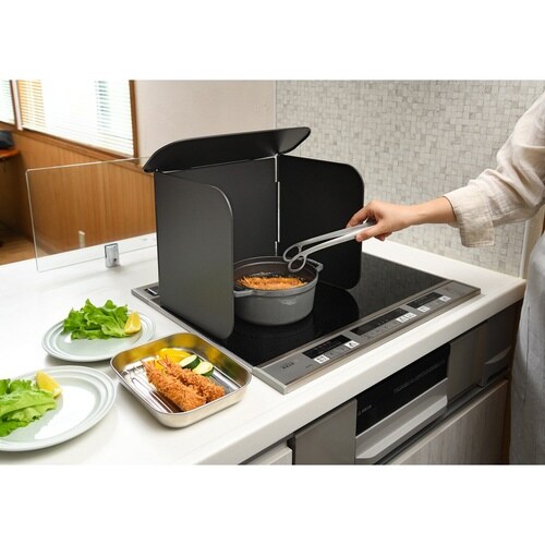 キッチンの壁やコンロに飛び散る料理の油や、汚れを逃さずキャッチする4面レンジガードです。 コンロに置くだけの簡単設置です。 |