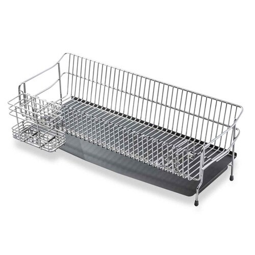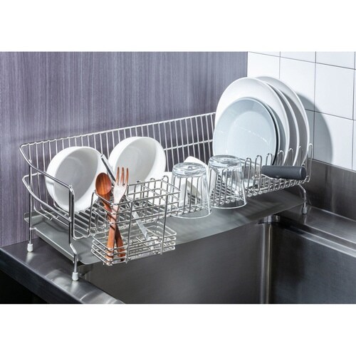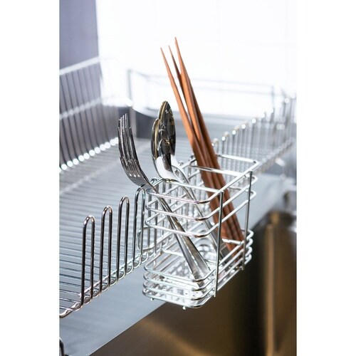 幅22cmのステンレス水切りかごです。 シンクの奥行スペースをフル活用できて大容量に収納できます。 カトラリーポケット、包丁スタンド付きです。 |