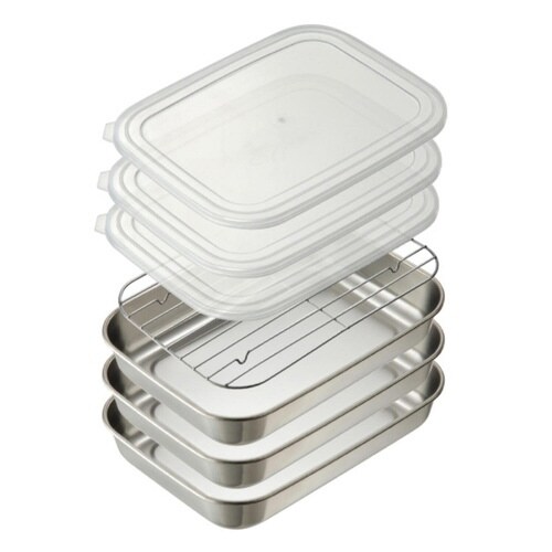 料理の下準備に活躍するバットセットです。 バットにアミをのせれば揚げ物バットとして油切りに使えます。 保存に便利な蓋付きです。 重ねてコンパクトに収納できます。 |