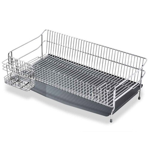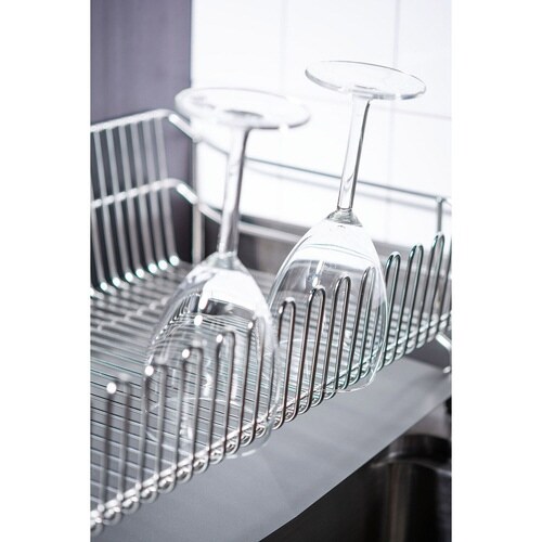 幅30cmのステンレス水切りかごです。 シンクの奥行スペースをフル活用できて大容量に収納できます。 カトラリーポケット、包丁スタンド付きです。 |