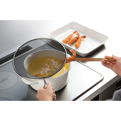 掃除、後片付けが格段にラクなる 手や顔への油ハネを徹底ガード! 鍋の中が見やすい、黒色のメッシュカバー 湯気、水蒸気は通すのでカラッと揚がる 持ちやすい短めハンドル |