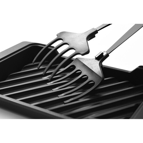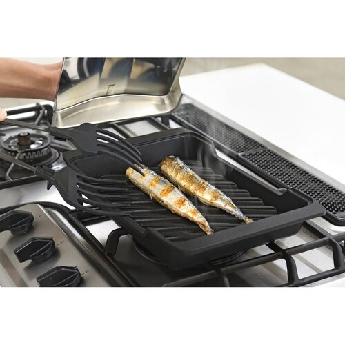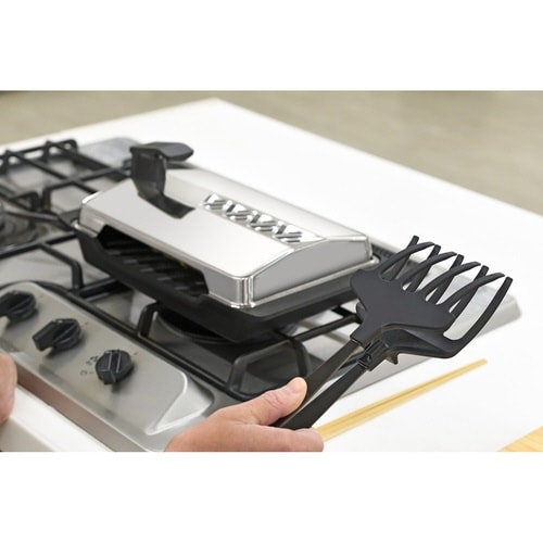 魚をはさむ先端部はカーブが大きく安定感があり、どんなサイズの魚も無理なくつかめます。 焼き上がりを皿に盛り付けるときもスムーズです。 先端が浮くので置いた時にテーブルを汚しません。 |