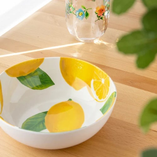 レモン柄が爽やかな印象のボウルです。 メラミン樹脂製で軽く割れにくいので安心して使えます。 テラスやガーデンでのお食事にも最適です。 食洗機に対応しているのでお手入れも簡単です。 |