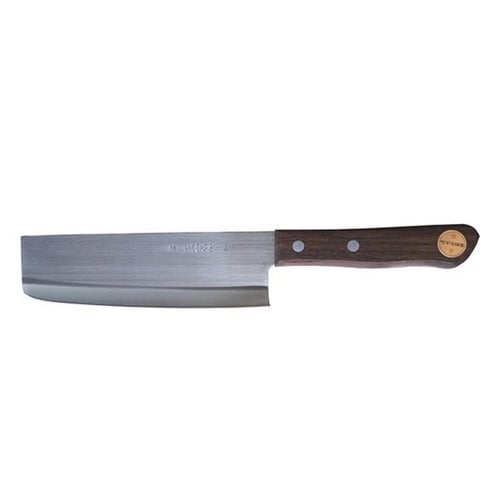 刃渡り16.5cmの菜切り包丁です。 刃は薄く幅広く、切っ先は四角くなっていてとがっていないため、大根や白菜などの大きな野菜も切りやすくなっています。 |