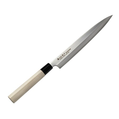 本格刺身包丁24cmです。 左利きの方々にも配慮して設計された和包丁で、右利き用、左利き用がございます。 繊維を傷付けない口当たりの良さは、刺身包丁でしか出すことができません。 |