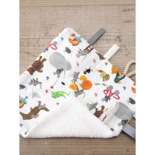 おもちゃのように赤ちゃんが楽しめるハンカチです。 押し笛が入っており、押すと音が鳴ります。 さまざまな種類のひもやリボンを触って遊べます。 赤ちゃんにやさしい綿100%&安心の日本製です。 |