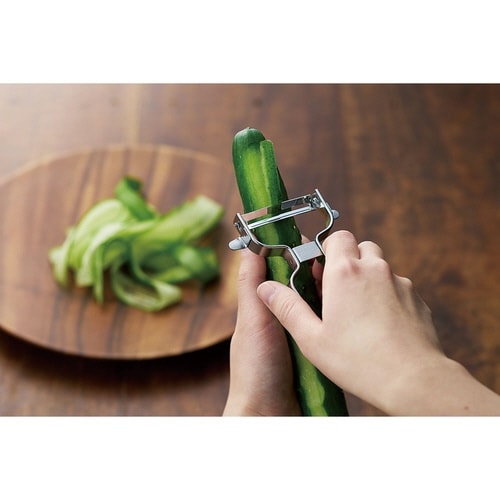 野菜の丸みに合わせたカーブ刃で薄皮を綺麗に皮むきができます。 野菜を薄く長くカットできるので、くるくるまいておつまみ作りや、サラダにしてもかわいく仕上がります。 丈夫でさびにくいステンレス製です。 |