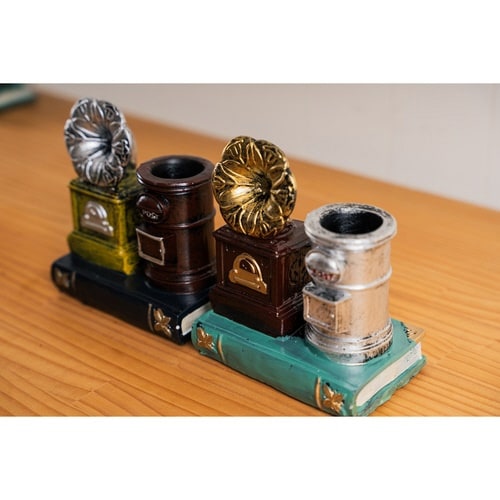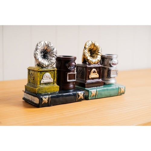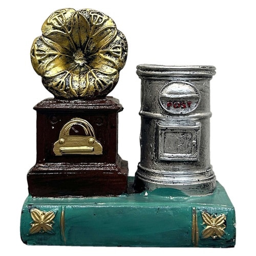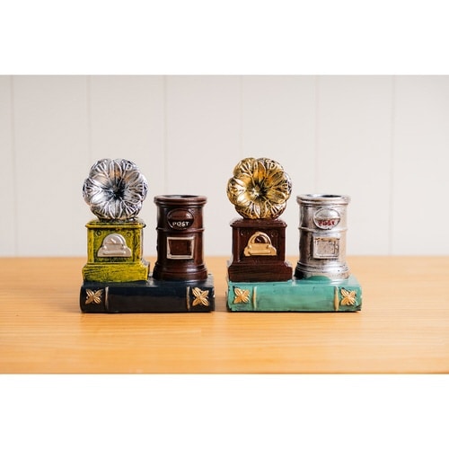 洋書とポストをかたどったペンスタンドです。 重厚感のある蓄音機モチーフが、雰囲気をさらに高めてくれます。 玄関や狭いスペースにちょこっと置けるサイズです。 |