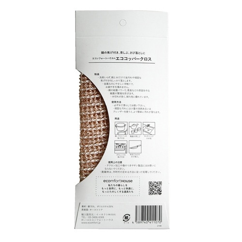 銅の力を利用して茶渋や水あか、焦げ付きなどの汚れを落とすエココッパークロスです。 金属なのに優しい手触りで、お鍋や手を傷つけにくいです。 クロスタイプなので、細かいところも洗いやすいです。 |