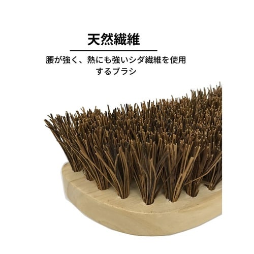 使いやすいかたちのハンドブラシです。 持ち手部分は手に馴染む曲線の形状のため、力が入れやすいです。 コシが強く、熱にも強いシダ繊維を使用しています。 |