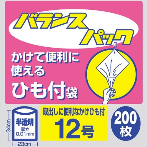 ポリ袋200枚入りです。 規格袋12号でサイズは約縦34×横23cm、A4が入るサイズ感です。 0.01mm厚さでしっかりした使い心地です。 かけて取り出す際に便利なひも付きです。 |