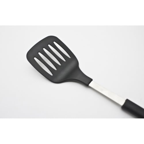 肉や魚を返すのに便利なナイロン製のターナーです。 ヘッド部は剛性・耐熱性に優れた66ナイロンを使用し、フライパンなどの表面を傷つけにくいです。 |