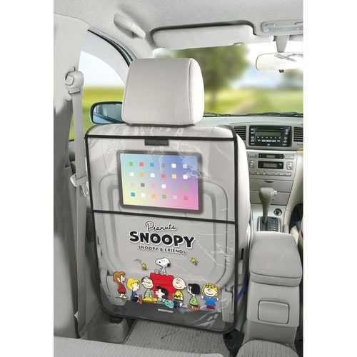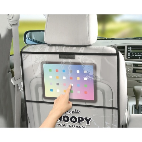 シートの背面をすっぽり覆う大き目サイズのキックガードです。 靴が当たってシートが汚れるのを防ぎます。 タブレットを収納しながら動画の視聴もできる透明ポケット付きです。 |