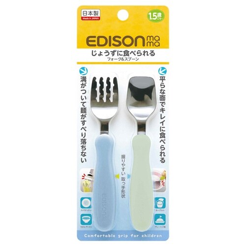 先端を薄くしているので口当たり滑らかなフォークとスプーンです。 1.5歳ころからのお子様向けです。 独自のデザインは、「上手持ち」「下手持ち」など、さまざまな持ち方でも握りやすくなっています。 |