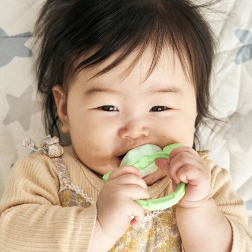 ひょっこり現れるラズベリーの実がキュートな歯がためです。 乳歯が生え始めるときの不快感を軽減します。 ラズベリーの実はお口に含みやすいおしゃぶりサイズです。 |