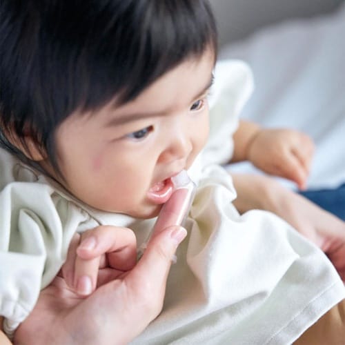 指にはめて磨くやわらか指歯ブラシです。 歯の生え始めのお子様におすすめです。 指にしっかりフィットするので指にはの触感が伝わり、力加減がしやすいです。 |