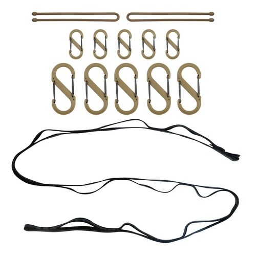 10個のコヨーテカラーのエスビナーがロープ(デイジーチェーン)についたアイテムです。 ロープの両端にギアータイを取り付けられるので、色々な場所でお使いいただけます。 |