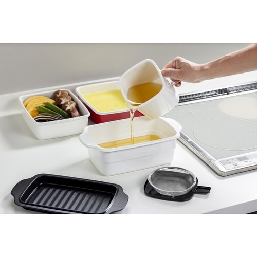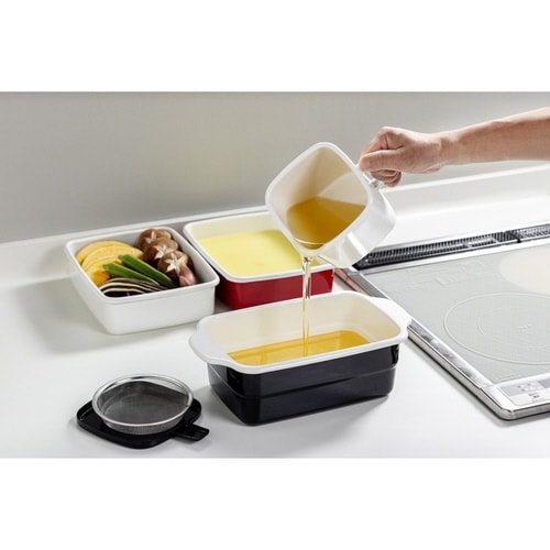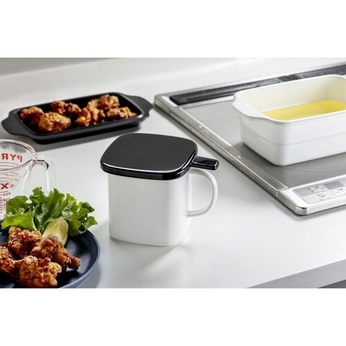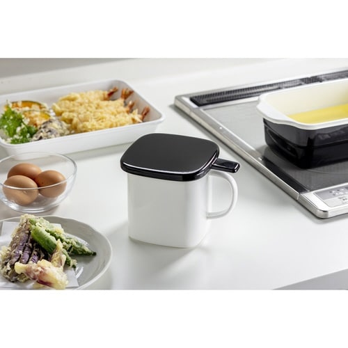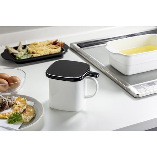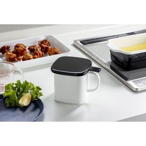 ホーロー製の角型オイルポットです。 四角い形で注ぎやすく、片付けやすいです。 ホーロー製品は腐食に強く清潔、お手入れ簡単です。 蓋付きでホコリから油を守ります。 こしアミ付きで油を再利用できます。 |