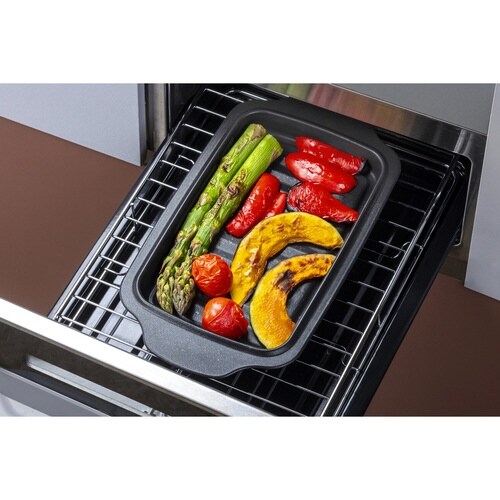魚焼きグリルとトースター両方で使えるトレーです。 底がウェーブ状になっているので、余分な油が溝に落ちてヘルシーに調理できます。 フッ素Wコートで食材がこびり付きにくいです。 |