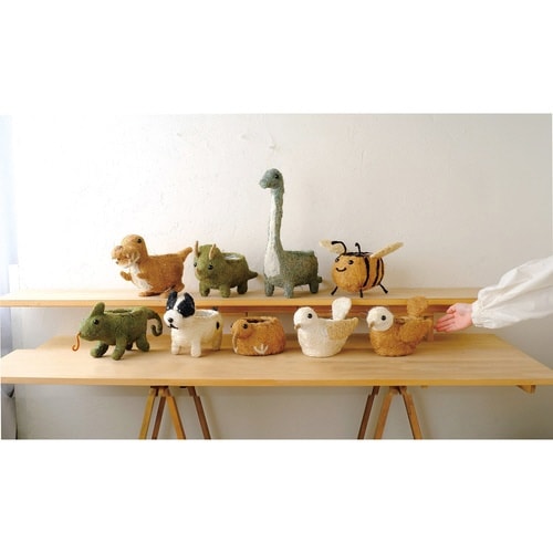 チャームポイントがたくさんな「トリケラトプス」の植木鉢です。 背中にお気に入りの観葉植物を入れて飾れます。 個性豊かな「ひだまりアニマルポット」が大集合しました。 |