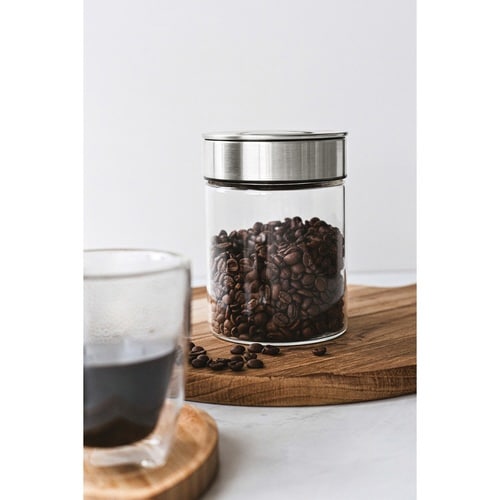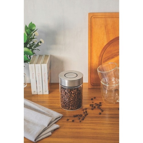 ステンレスフタとガラスの組み合わせがスタイリッシュで、洗練されたデザインのキャニスター700mlです。 調味料や乾物、コーヒー豆や茶葉を入れるのにちょうどいいサイズです。 |