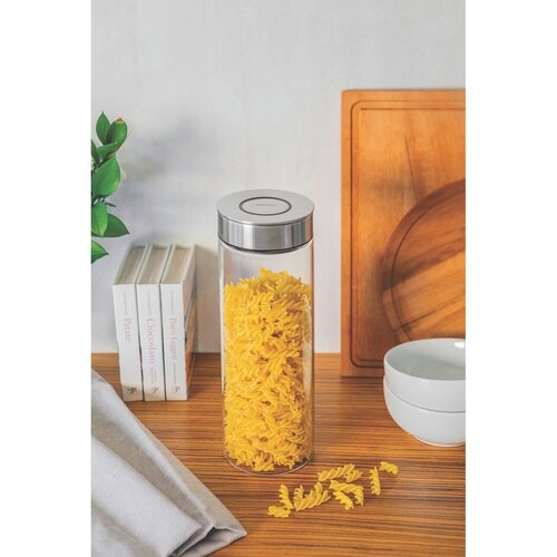 ステンレスフタとガラスの組み合わせがスタイリッシュで、洗練されたデザインのキャニスター1.8Lです。 シリアルやパスタを入れるのにちょうどいいサイズです。 |