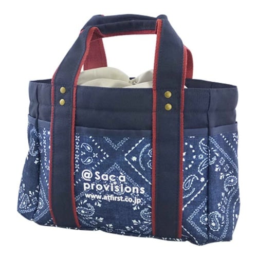 カジュアルなバンダナ柄のトート型ランチバッグです。 内側にはアルミ蒸着フィルムを使用しているので、保冷・保温効果が期待できます。 |
