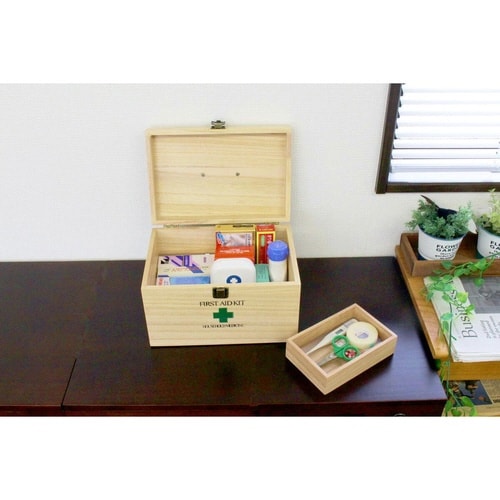 取り外しできるトレー付き 軽くて調湿製抜群 インテリアにもなる救急箱 色んなものをまとめて収納 持ち運びに便利な持ち手付き |