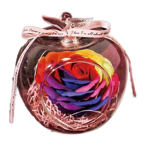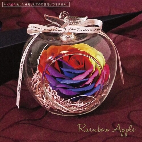 華やかな色合いが目を引くレインボーローズのインテリアです。 リンゴの形のガラスドームが、キュートさを引き立てています。 ソープの優しい香りに癒されます。 |