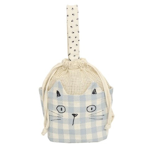 柄の生地にネコの顔が入った可愛い巾着ポーチです。 ハンドル部分には愛らしいネコの肉球のプリントが入っています。 マチ幅は約10cmなので、厚みのあるものも入れていただけます。 |