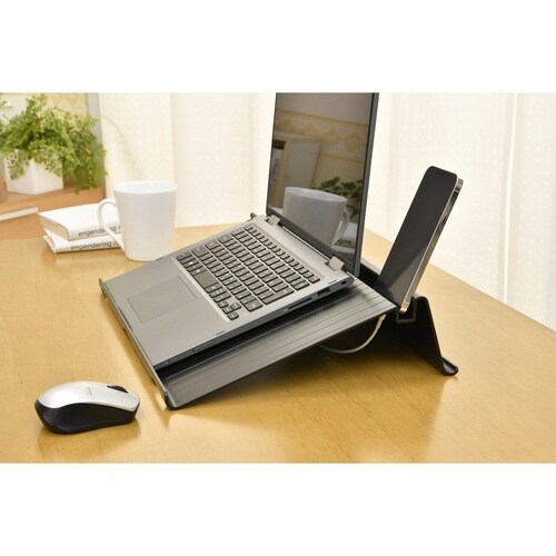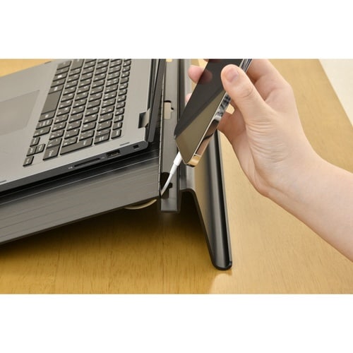 背筋が伸びて、長時間のPC作業もラクラクできるノートパソコンスタンドです。 折りたたみ式です。 スマホを立てても、横向きでも使用しながら充電できます。