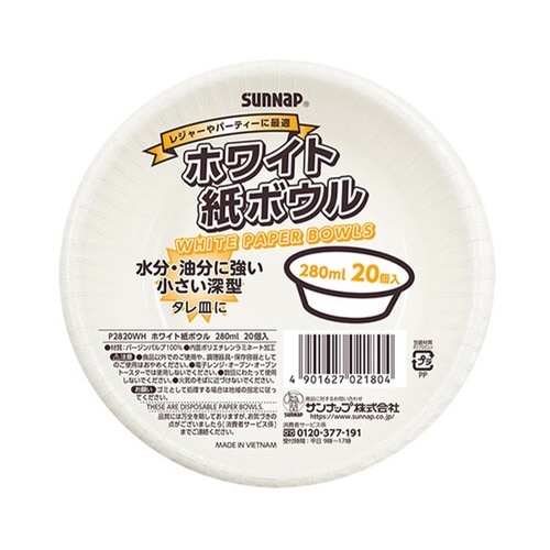 レジャーやパーティーに最適なホワイト紙ボウル(280ml)です。 水分・油分に強い深型タイプで、タレ皿としてのご使用におすすめです。 20枚入です。 |