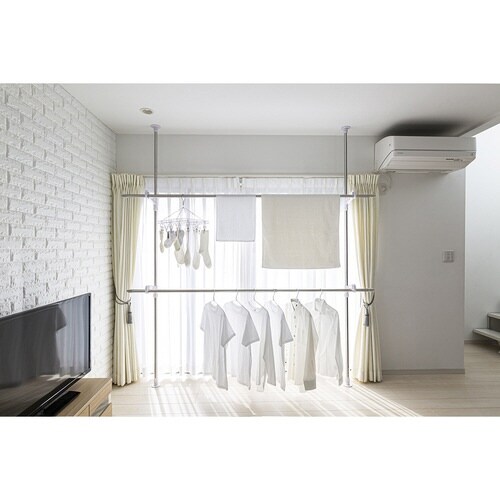 すっきり省スペースにたくさん干せる、突っ張り式物干しポールです。 女性でも簡単に設置できて移動もラクラクです。 好きな角度・好きな高さに調節できます。 折りたたんで収納もできます。 |