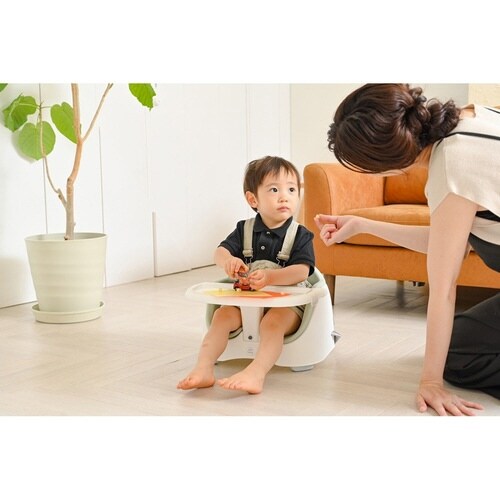 床の上でもイスの上でも使える2way仕様のベビーチェアです。 本体は約2kgと軽く、背面に取っ手がついているので、持ち運びもらくらくです。 お子様をしっかり支える3点式安全ベルト付きです。 |