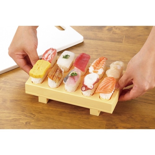 みんなで楽しく、にぎり寿司づくりができる飛び出すおすしメーカーです。 型枠に酢飯を詰めて、ネタを乗せ、押し型に乗せてポンッと押し出せば、10貫のおすしが現れます。 |