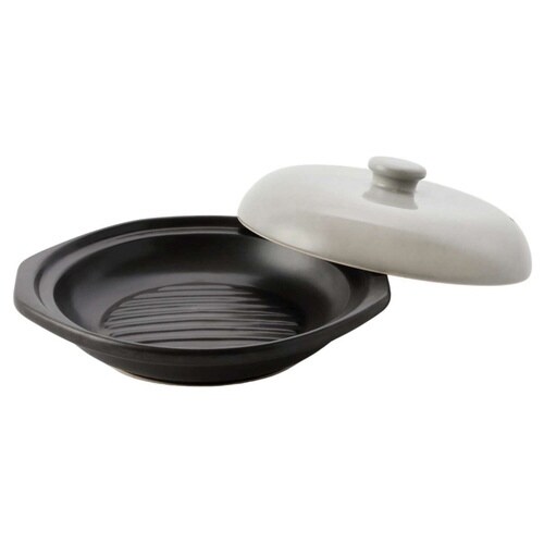電子レンジで温めるだけで、フライパンのような焼き目がつけられます。 陶器の遠赤外線効果でこんがり&ふっくら仕上がります。 蓋を外せば、オーブン・魚焼きグリルでもお使いいただけます。