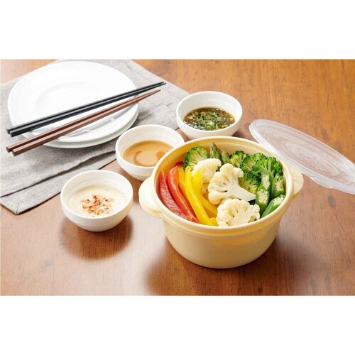 電子レンジで手軽に蒸し野菜が作れるたっぷりサイズのレンジ調理容器です。 調理してそのまま食卓へ並べられるデザインなので、他の器に移し替える手間がありません。 |