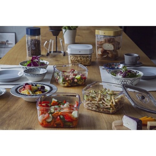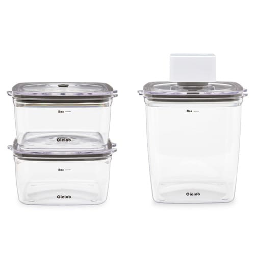 容器内を食材保管に最適な真空率に保てる、樹脂製保存容器セットです。 食材を入れて蓋をし、バキュームポンプをセットすると、ポンプが容器内を最適な真空率に調整します。 |