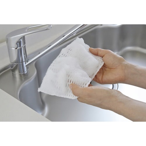 回収PETボトルから再生したリサイクルポリエステル繊維を使用したキッチン用あみたわしです。 最新テクノロジーのV字カットされた髪の毛より細いベルカップル糸が、キレイに汚れをかき取ります。 |
