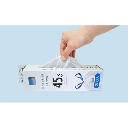 袋が簡単に結べる紐付きのゴミ袋20枚入りです。 結び目のロスが少ないため、容量いっぱいまでゴミが入ります。 紐を引っ張ることで袋が閉まるので、手を汚さずに結ぶことができます。 |