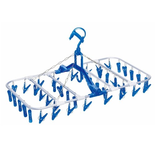 軽くて丈夫なアルミ角ハンガー42ピンチ付きです。 軽量フレームで持ち運びしやすく、竿にも掛けやすいです。 ワンタッチ式フックの内側に特殊ラバー加工が施されていて、竿に掛けた時にズレにくいです。 |